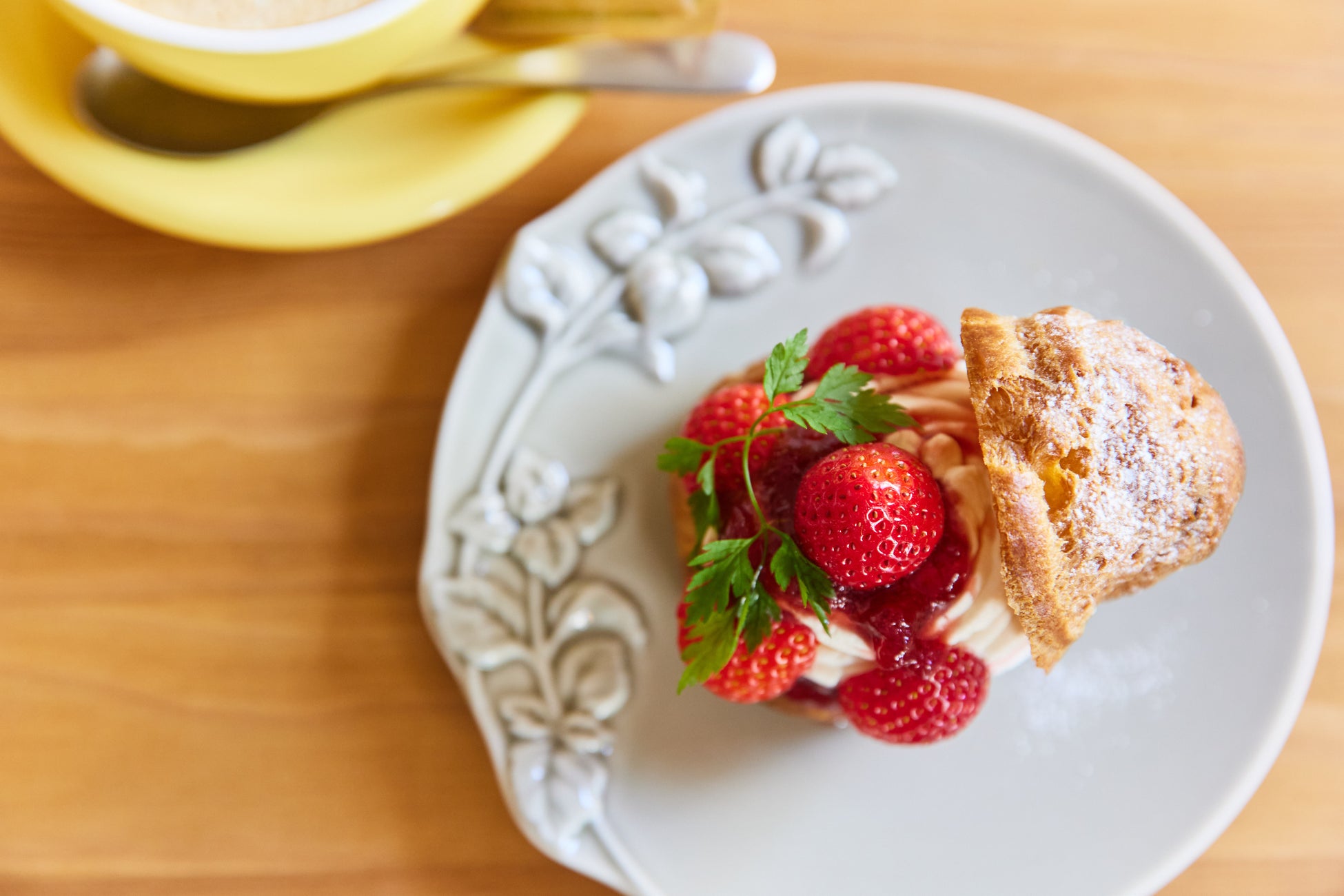 外はパリッと、中はモチっとしているシュー生地の中身は、カスタードクリームの上に、マスカルポーネを混ぜた生クリームを重ね、イチゴを贅沢にトッピング。程よい甘さと酸味がクセになる一品です。