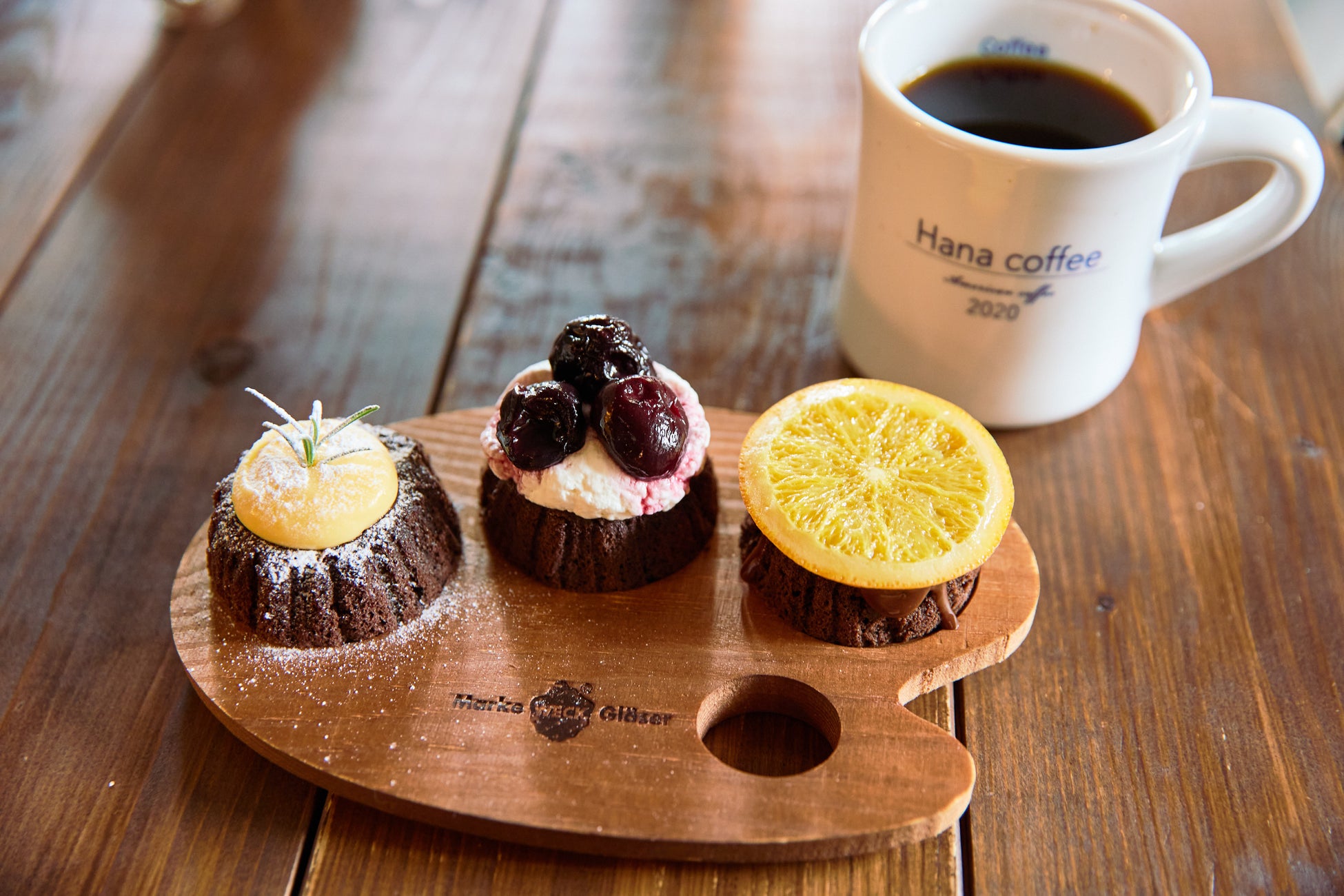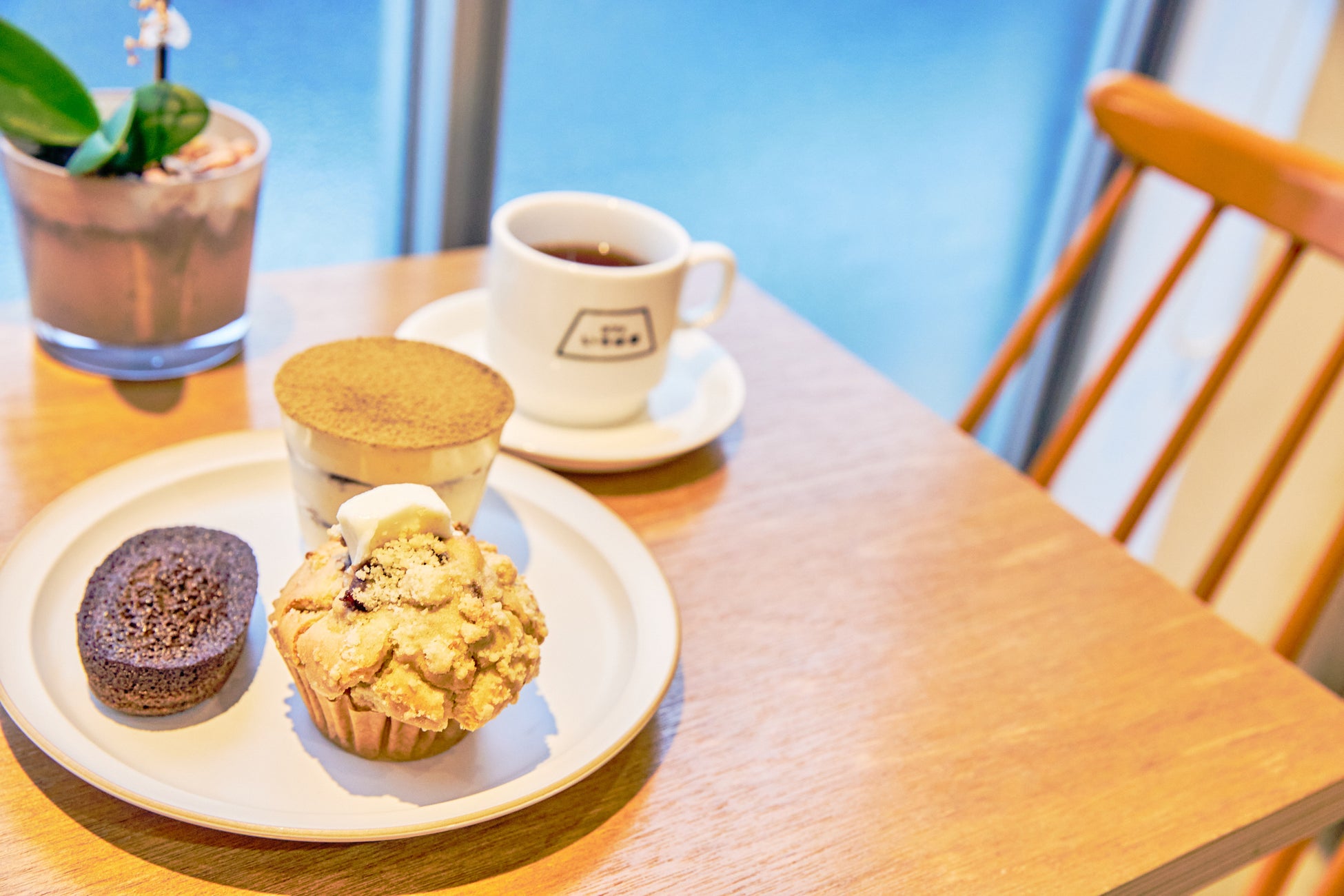 色々なパティシエさんが日替わりで、個人店とコラボして開発した逸品やアイデアスイーツを提供しています。取材時の映えスイーツは、pechecoさんの「あずき塩バター米粉マフィン」(写真上)、cano's factoryさんの「ほうじ茶フィナンシェ」(写真下:左)&「焦がしほうじ茶ティラミス」(写真下:右)。空間を活かせるシンプルで飾らない姿が、今っぽさのある映えスイーツです。