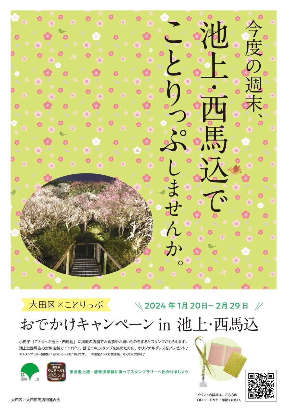梅の開花時期に合わせて、池上本門寺や梅園などの美しいスポットを含む、東京都大田区の池上・西馬込エリアにおいて「ことりっぷ(昭文社)」とのタイアップキャンペーンを実施します。この機会に、当該エリアの新たな魅力を発信し、商店街の活性化、当該エリアの来街者の増加と回遊性向上を図ります。