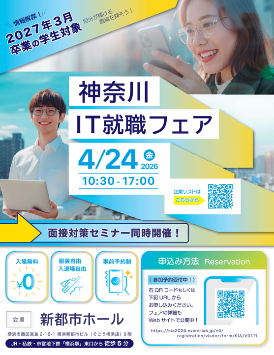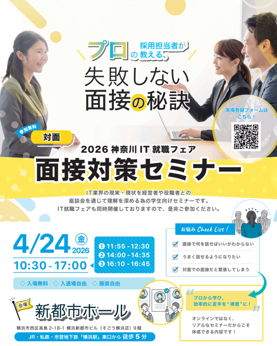 下記の通り、2027年3月卒業生を対象とした「合同企業説明会」を2026年4月24日に開催致します。例年通り新都市ホールでの開催を企画しており、今年も開催する運びとなりました。IT業界のことを知りたい、聞いてみたい方はぜひご来場をお待ちしております。また、併せて、「面接対策セミナー」も行っており、参考にしていただけますと幸いです。多くのご来場をお待ちしております。