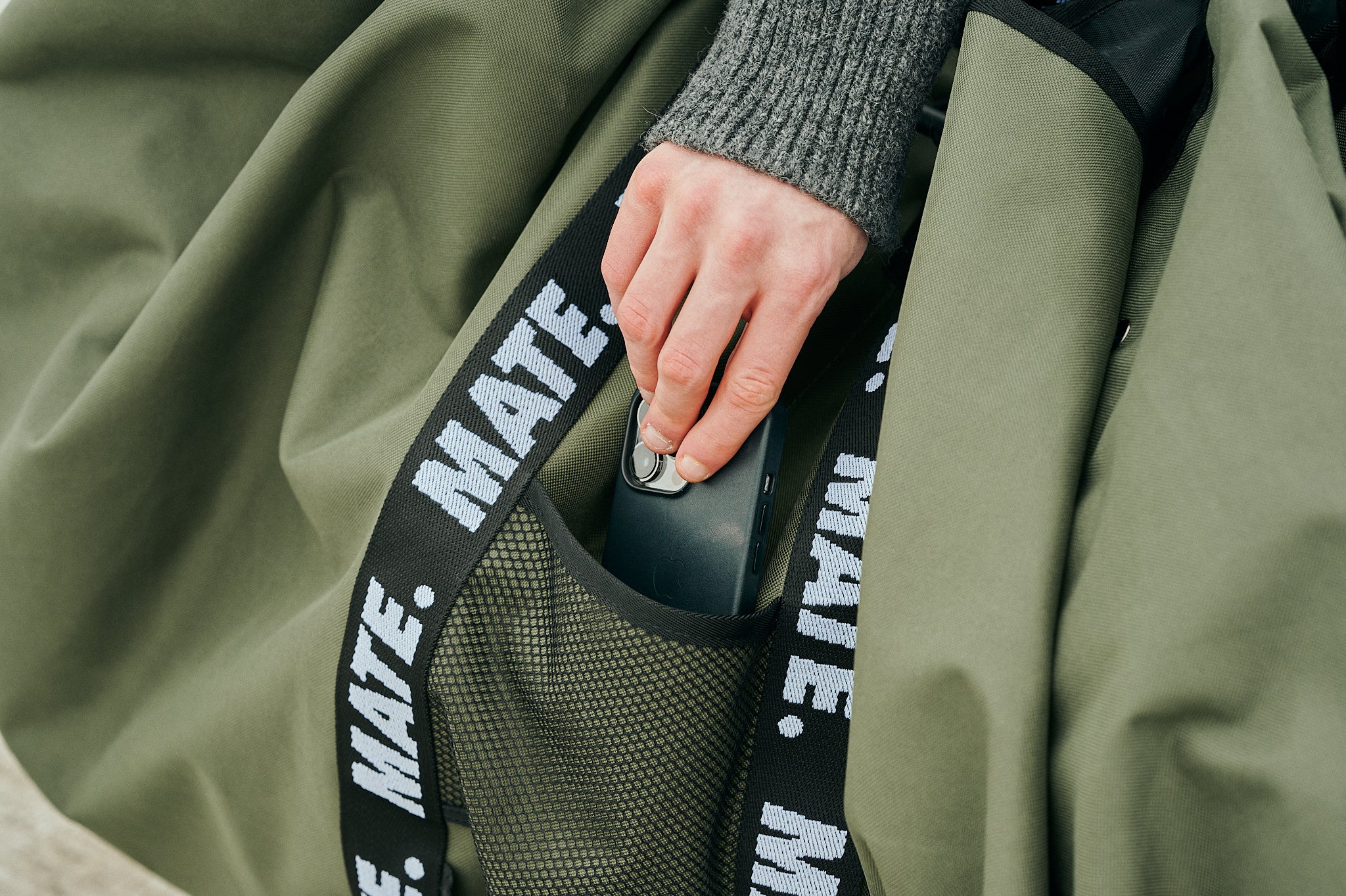 移動時や自宅での保管時など、大切なe-BIKEの保護をコンセプトに開発されたMATE BAGは、耐久性と撥水性のあるタフなファブリックを採用。クイックな車体収納を可能にするアジャストコードをデザインしています。防水性のあるPVC加工を施した裏面には、総柄のブランドロゴをあしらい、車体を配置する際の目安となるパッドを配しました。また両サイドには、持ちやすいよう配慮された取手や鍵等のアクセサリー収納に活用できるポケットも備えています。