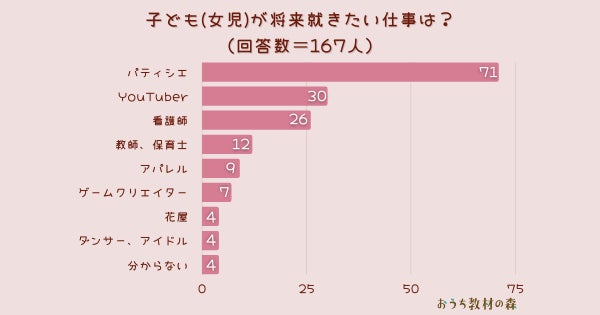ARINA株式会社が運営する幼児、小学生の親御さん向けの教育メディア「おうち教材の森」(https://naki-blog.com/study/)は、日本全国の中学生以下のお子さんをお持ちの親御さんを対象に「子ども(女児)が将来就きたいと言っている仕事は?」とアンケート調査を実施しました。その結果を公表します。