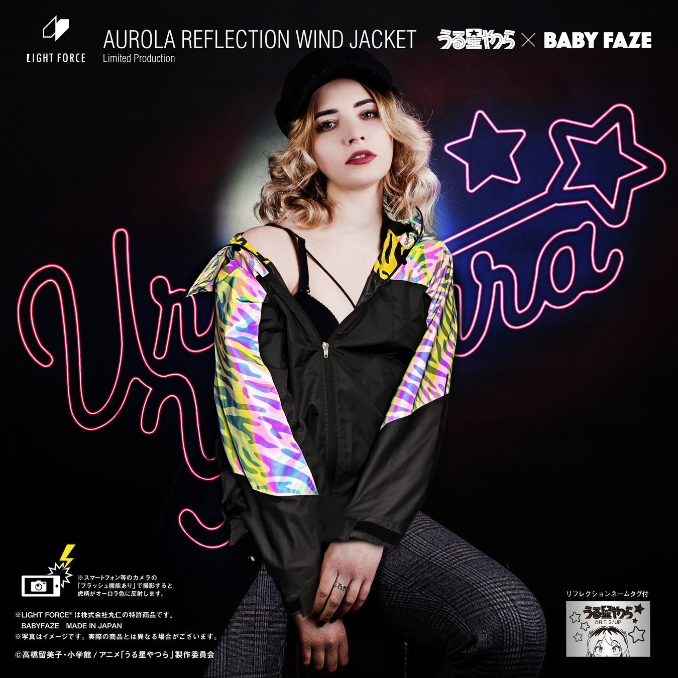 うる星やつら×BABY FAZEのオリジナルグッズ最新作。漫画家・高橋留美子氏の世界をこよなく愛するクリエイティブディレクターBABY FAZEが、伝家の宝刀オーロラリフレクションのインパクトを追求して企画したアパレルプロダクツ。スマートフォン等の「フラッシュ機能あり」で撮影すると、ビリビリ電撃を浴びたように虎柄パターンがオーロラ色に反射して映ります。快活でキュートなラムちゃんをイメージしたこのアパレルシリーズは完全数量限定生産。宇宙レベルのおしゃれアイテムです。