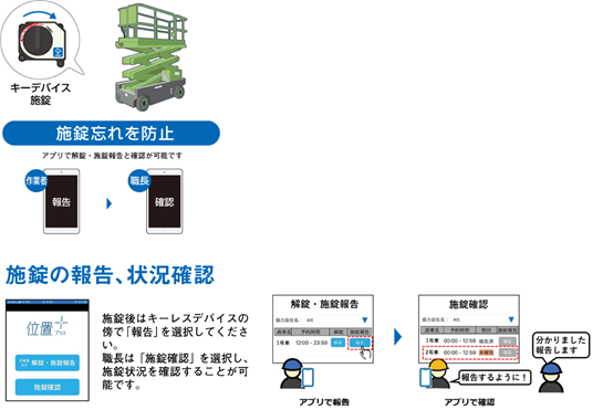 作業終了後、アプリを使用して建設現場内の高所作業車の施錠状態の確認を行えます。高所作業車の利用者は、作業終了後にアプリ内の報告ボタンを押してクラウドサーバーに施錠記録を送信します。現場管理者は、この情報をアプリ内で一元管理することで、施錠状態の確認が可能となり、施錠忘れの防止により、安全性の向上に繋がります。