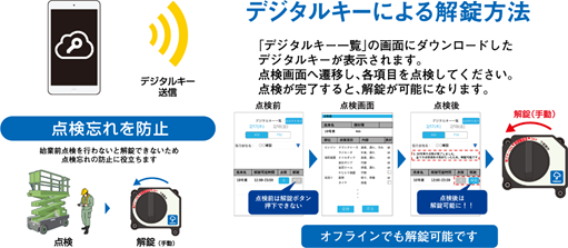 デジタルキーを使用し、高所作業車の解錠を行う際に、アプリ内で点検記録の入力を必須とすることができます。点検記録の入力を完了しないと解錠ができない仕組みとすることができるため、未点検での機械使用を防止でき、安全性の向上に繋がります。