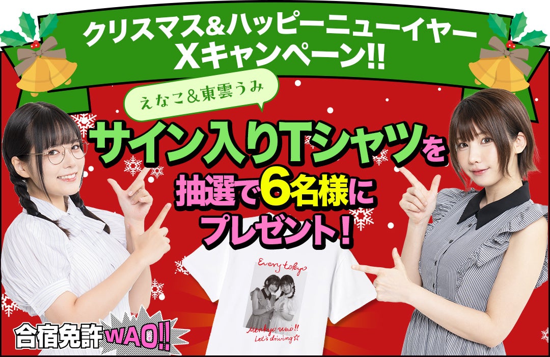 えなこ&東雲うみ×合宿免許WAO!!のクリスマス&ハッピーニューイヤーXキャンペーン開催!サイン入りTシャツプレゼント!