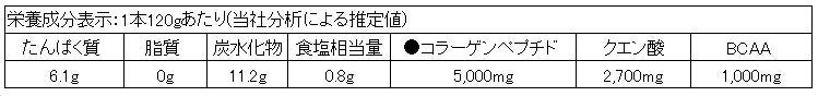 | 原材料名: | 豚コラーゲンペプチド(ゼラチンを含む、アメリカ製造)、 砂糖/酸味料、トレハロース、ロイシン、イソロイシン、 バリン、香料、甘味料(アセスルファムK) |