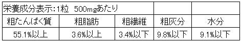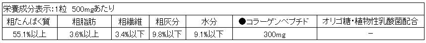 | 原材料名: | 豚コラーゲンペプチド(ゼラチンを含む、国内製造)、 澱粉、ミルクカルシウム、チーズ、フラクトオリゴ糖、 ポークエキス(小麦・大豆・豚肉を含む)、 植物性乳酸菌(殺菌)/セルロース、HPC、 ステアリン酸カルシウム、微粒酸化ケイ素 |