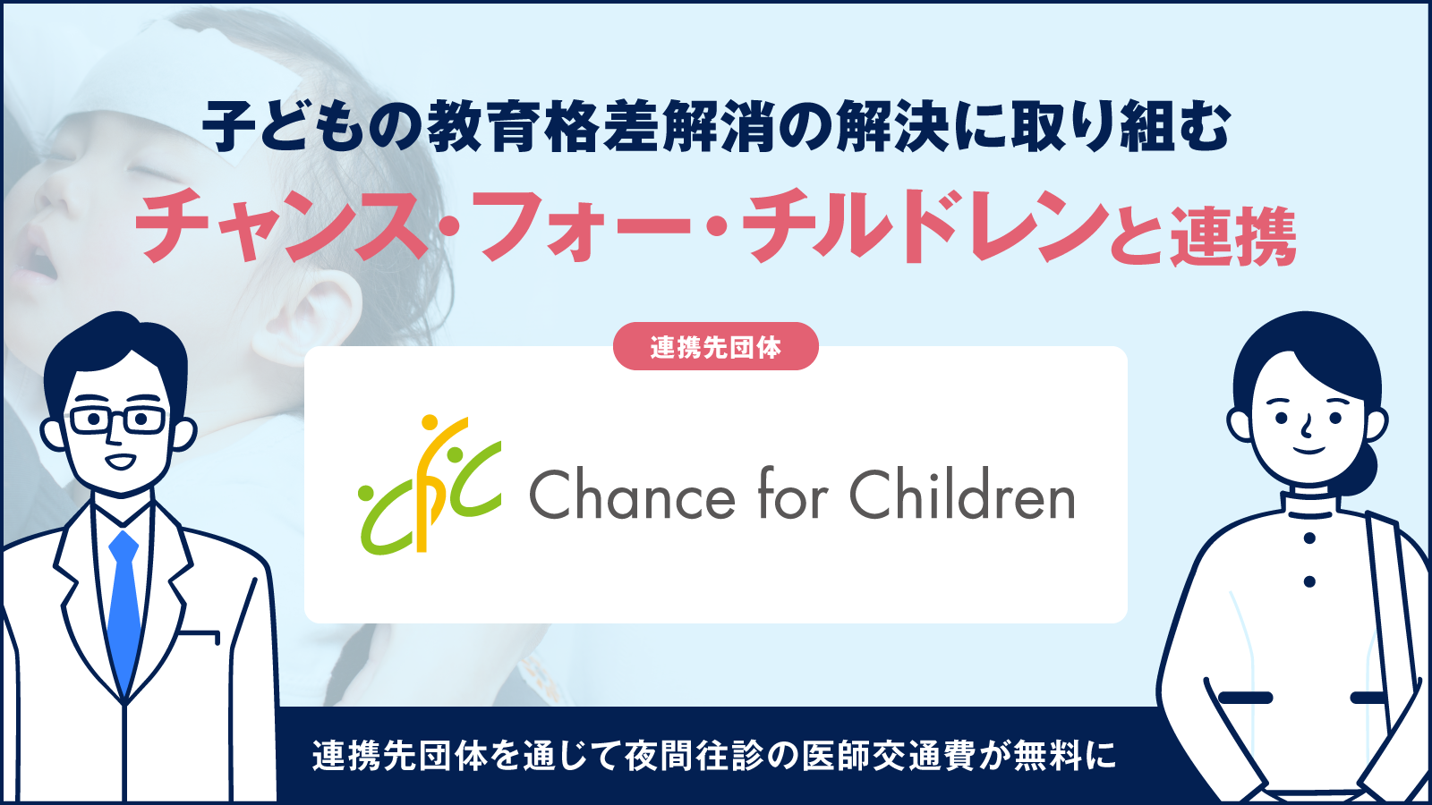 株式会社ノーススター(本社:東京都中央区、代表取締役社長:田北 浩大、以下「ノーススター」)は、家庭の経済格差による子どもの教育格差の解決に取り組む公益社団法人チャンス・フォー・チルドレン(東京都墨田区、代表理事:今井 悠介 奥野 慧、以下CFC)と連携し、CFCが支援するご家庭や子どもたちに向けて、医師の交通費無料で夜間往診を利用できるプランのご提供を開始します。
