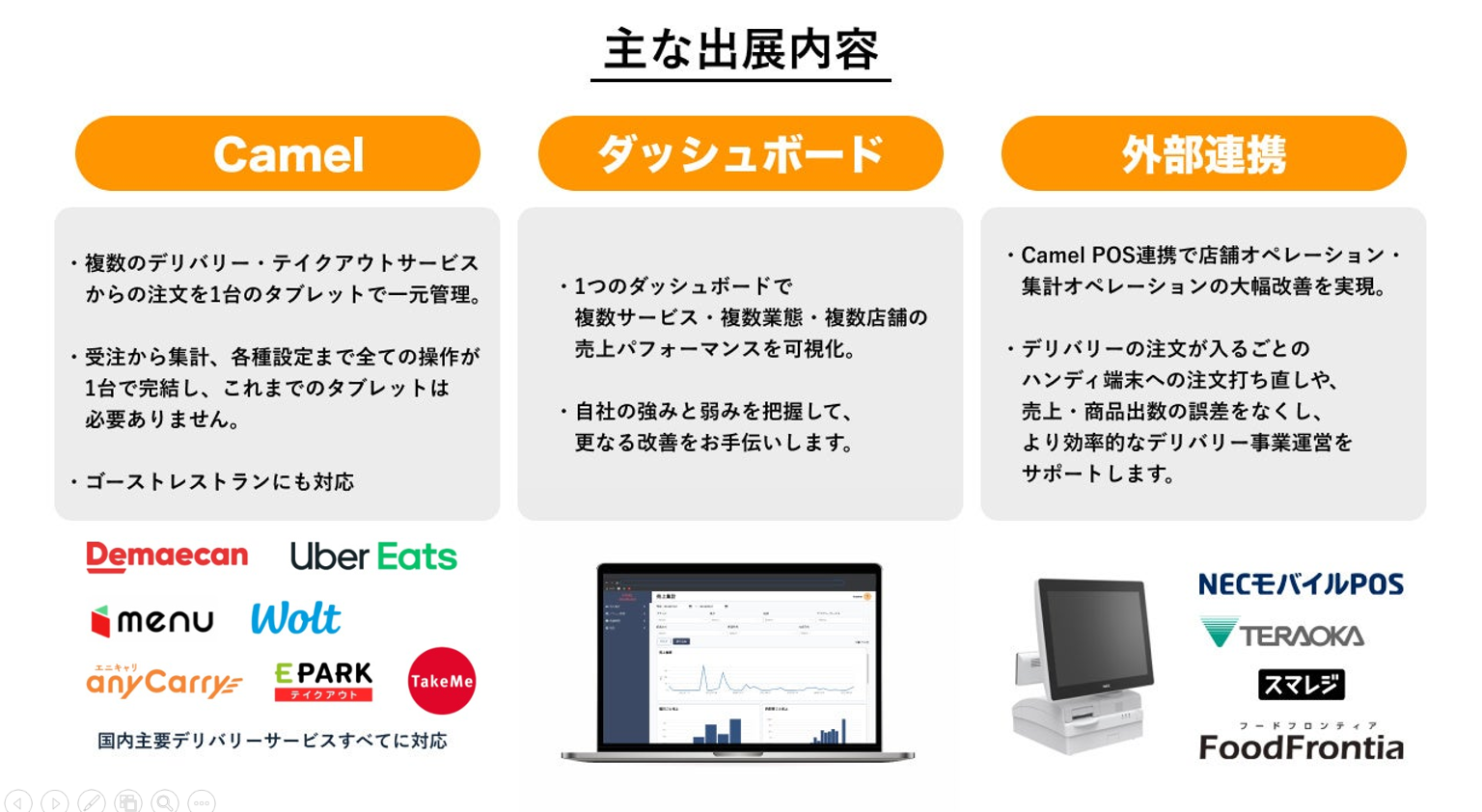 また、デリバリー注文一元管理サービスだけではなく、「Camel」と連携可能な日本電気株式会社様の「飲食店向けPOSシステム・オーダーエントリーシステム FoodFrontia(フードフロンティア)」やサブスク型POS「NECモバイルPOS」、感染症対策に有効な非対面・非接触サービス「PickupDoor」などをご用意し、デリバリー注文の受注~受け渡しまでのフローを分かりやすくご説明します。「デリバリー事業の売上を促進したい」、「店舗の業務を効率化してコストを削減したい」とお考えの皆さま、この機会にぜひ「Camel」のブースで実機をお試しください。みなさまのご来場を心よりお待ちしております。