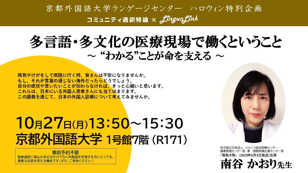 京都外国語大学(京都市右京区 学長:小野隆啓)は、ハロウィン特別企画として、りんくう総合医療センター 健康管理センター長・国際医療広報センター長の南谷かおり先生をお招きし、特別講義「多言語・多文化の医療現場で働くということ~“わかる”ことが命を支える~」を開催いたします。