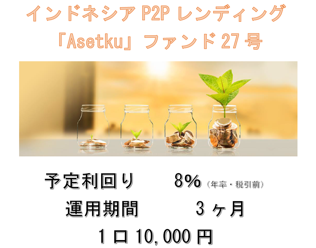 インドネシアP2Pレンディング「Asetku」ファンド27号の募集を本日15時より開始いたします。