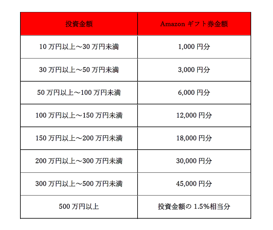 当ファンドに10万円以上ご投資いただいたお客様に、投資金額に応じたAmazonギフト券をプレゼントいたします。