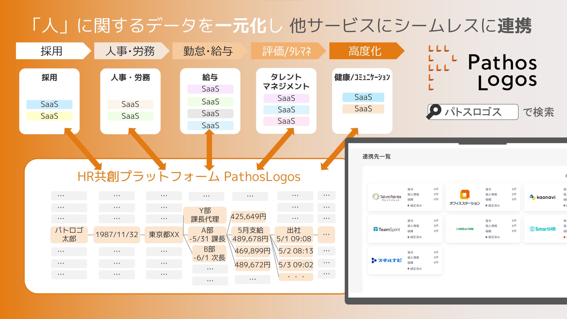 「PathosLogos」は、長年の人事業務に関するノウハウを集約し、「人」に関するデータを標準化しデータベースとして保持するサービスであり、機能レベルで各SaaSとデータ連携することが可能です。