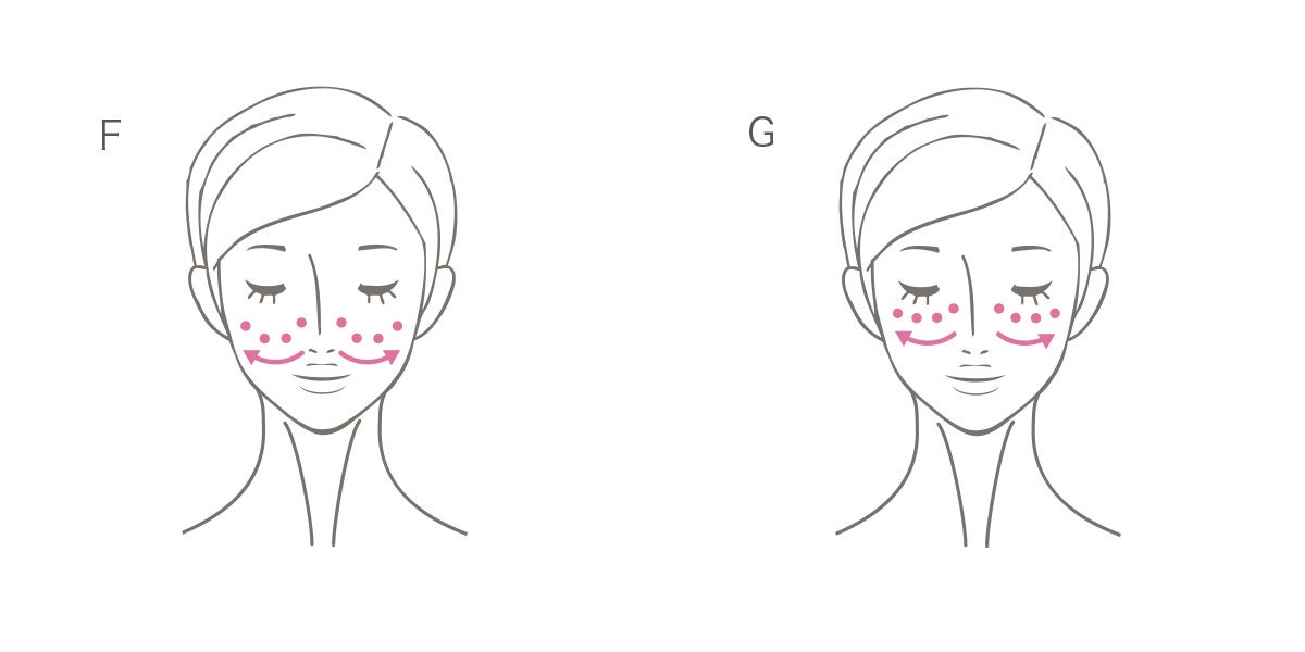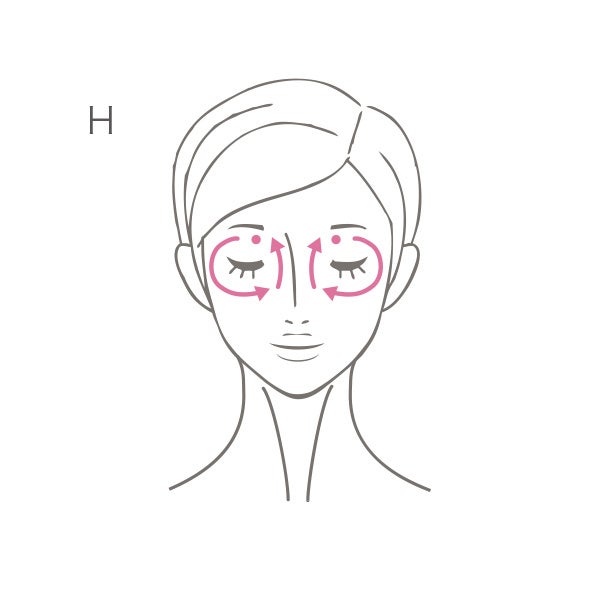 G 目の下の骨に沿って、Fと同じように点に人差し指と中指を当て、左右に動かしこわばりをとる。