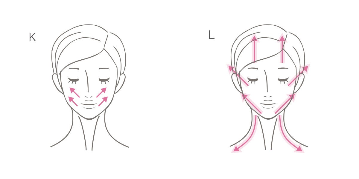 L 顔全体を手の指全体で矢印の方向に軽く押しながら上に引き上げる。