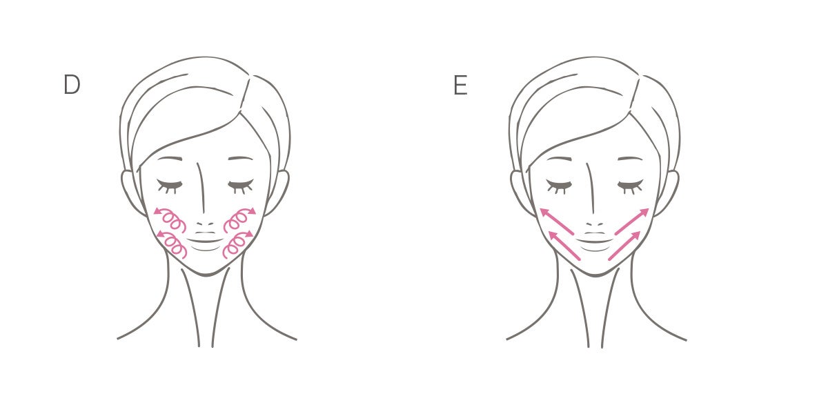 E 人差し指を曲げ、親指と顎のラインをはさみ、中心から耳の下に向かって押し流す。