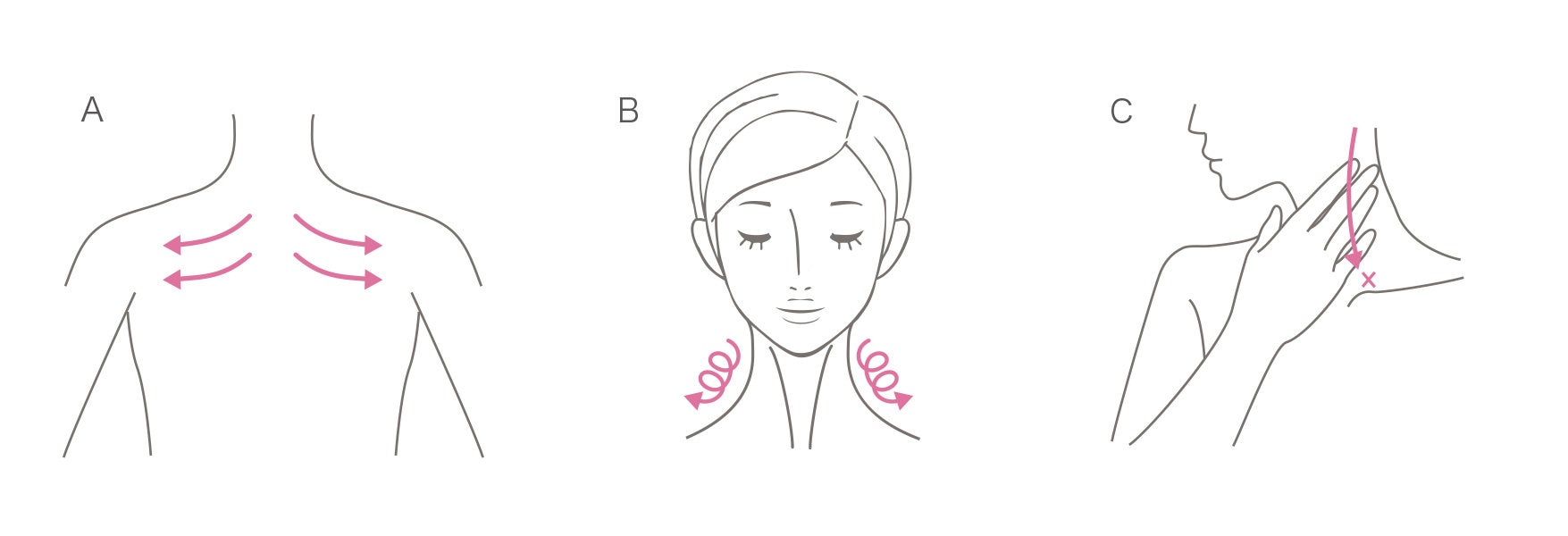 最後に、耳下腺から鎖骨に向かって、首の両側を上から下へと軽く擦る。