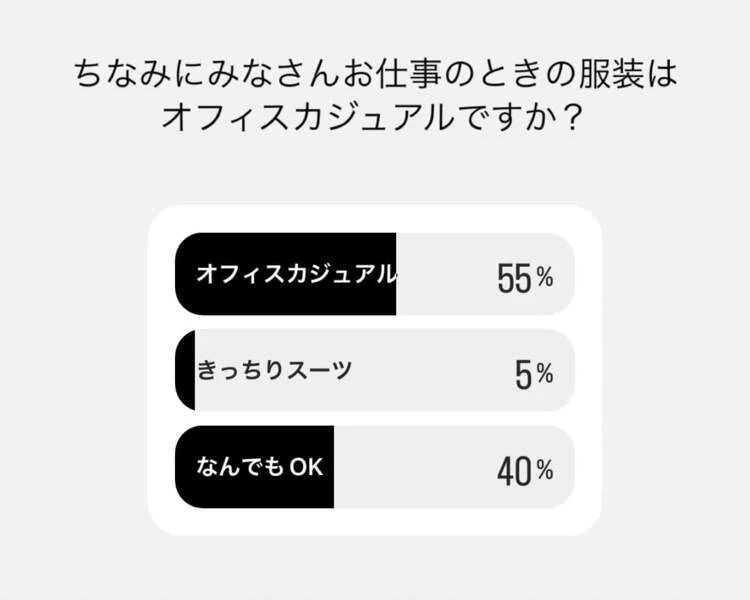 ちなみにお仕事での服装は、オフィスカジュアルやなんでもOKの方が圧倒的に多く、きっちりスーツの方は全体の5%ほどでした。