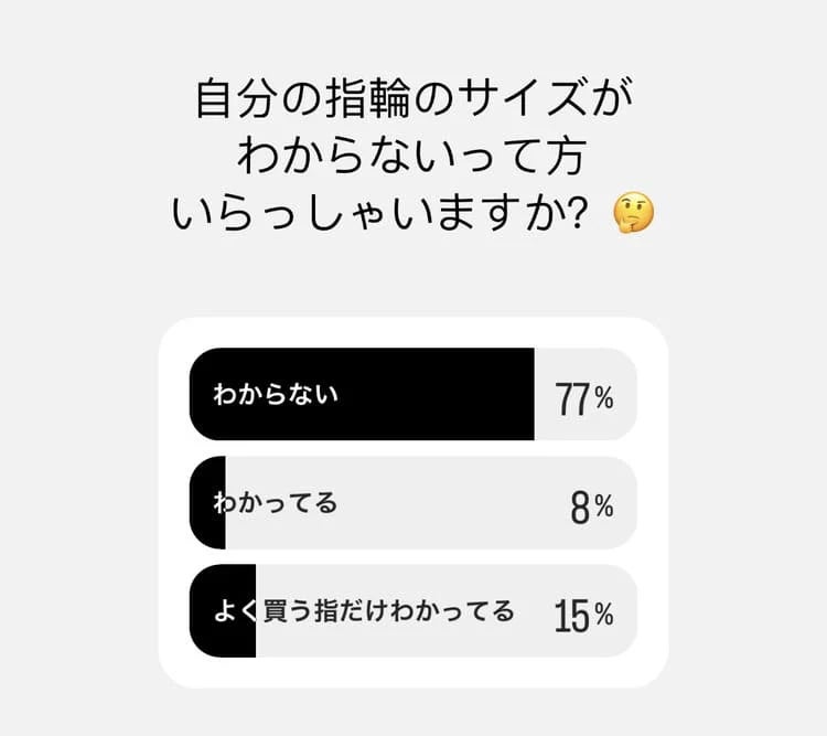 「わからない」と答えた人が圧倒的に多く、指輪のサイズ選びに悩む人はかなり多いようです。以下の記事では、自分の指に合った指輪サイズの選び方を詳しく解説しています。