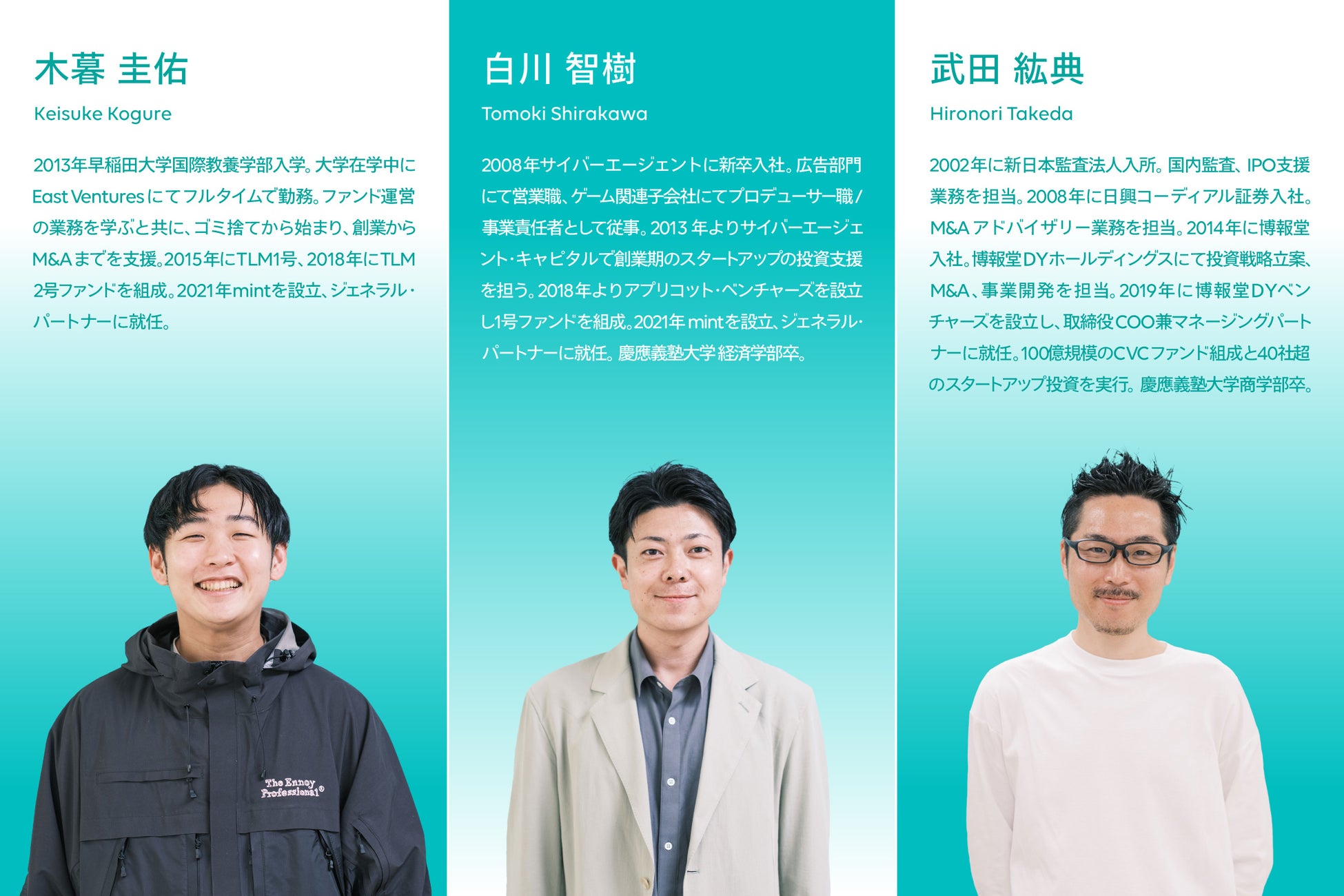 mintのGPは、学生時代から独立系ベンチャーキャピタルに在籍し、10年以上に渡りスタートアップに関わり続けている木暮、ITメガベンチャーで150名規模の事業運営を行っていた白川、監査法人での監査・IPO支援、証券会社でのM&A、事業会社での経営企画・オープンイノベーション・CVC運営など幅広い業務を担っていた武田の3名で構成されています。