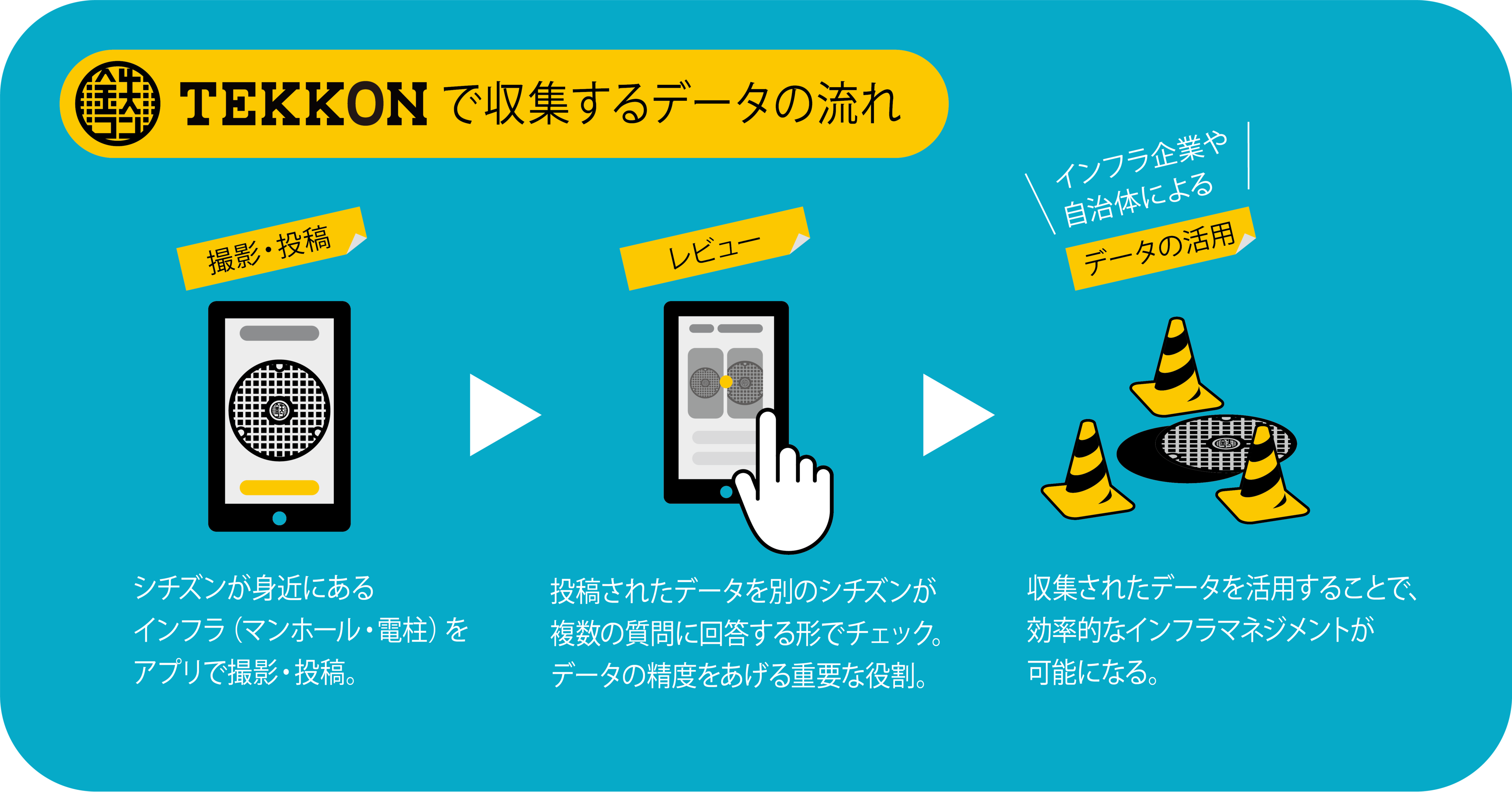 身近にあるインフラを「撮影・投稿」、投稿されたデータを「レビュー」することで精度の高いデータとなります。その後、収集されたデータはインフラ企業や自治体のもとに渡り、補修・交換が必要な箇所を効率的に判別することができます。