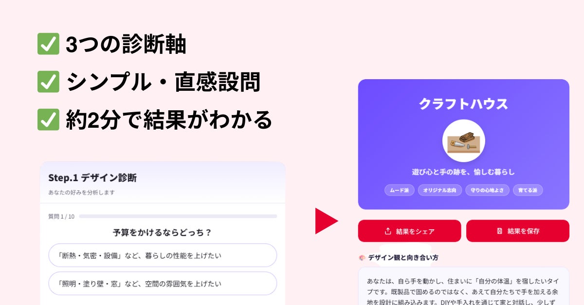 マイホームタイプ診断が、ハウスオーナー様にとっては「家づくりの軸を見つける出発点」に、住宅会社様にとっては「顧客理解を深める共通言語」となるよう、今後も機能改善とアップデートを重ねてまいります。