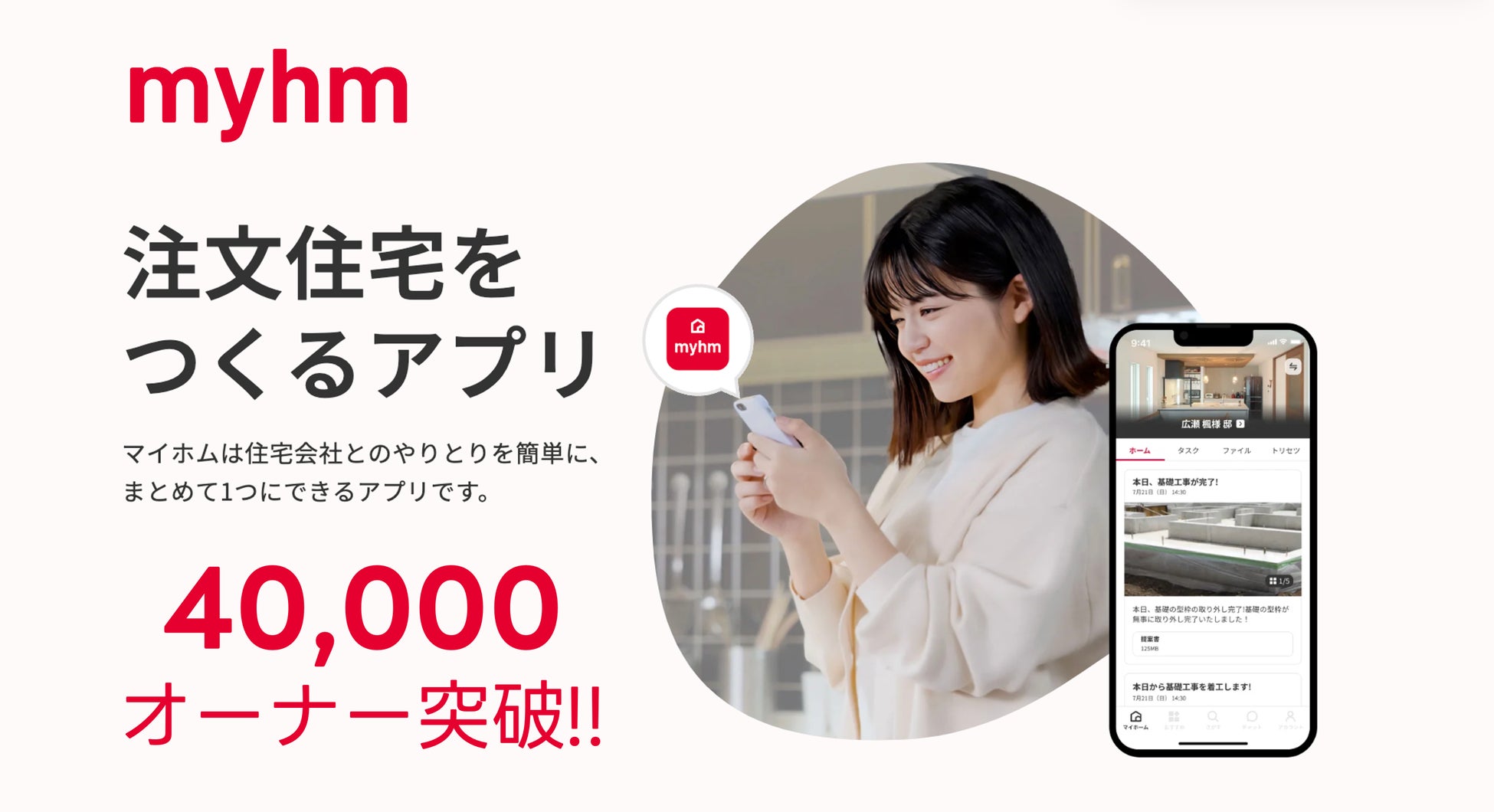 『マイホームアプリ』Google、Yahoo!検索ナンバーワン。ご利用マイホーム4万棟突破(※2026年3月時点)の、お施主様の家づくり体験を向上させる、住宅会社とのコミュニケーションアプリです。