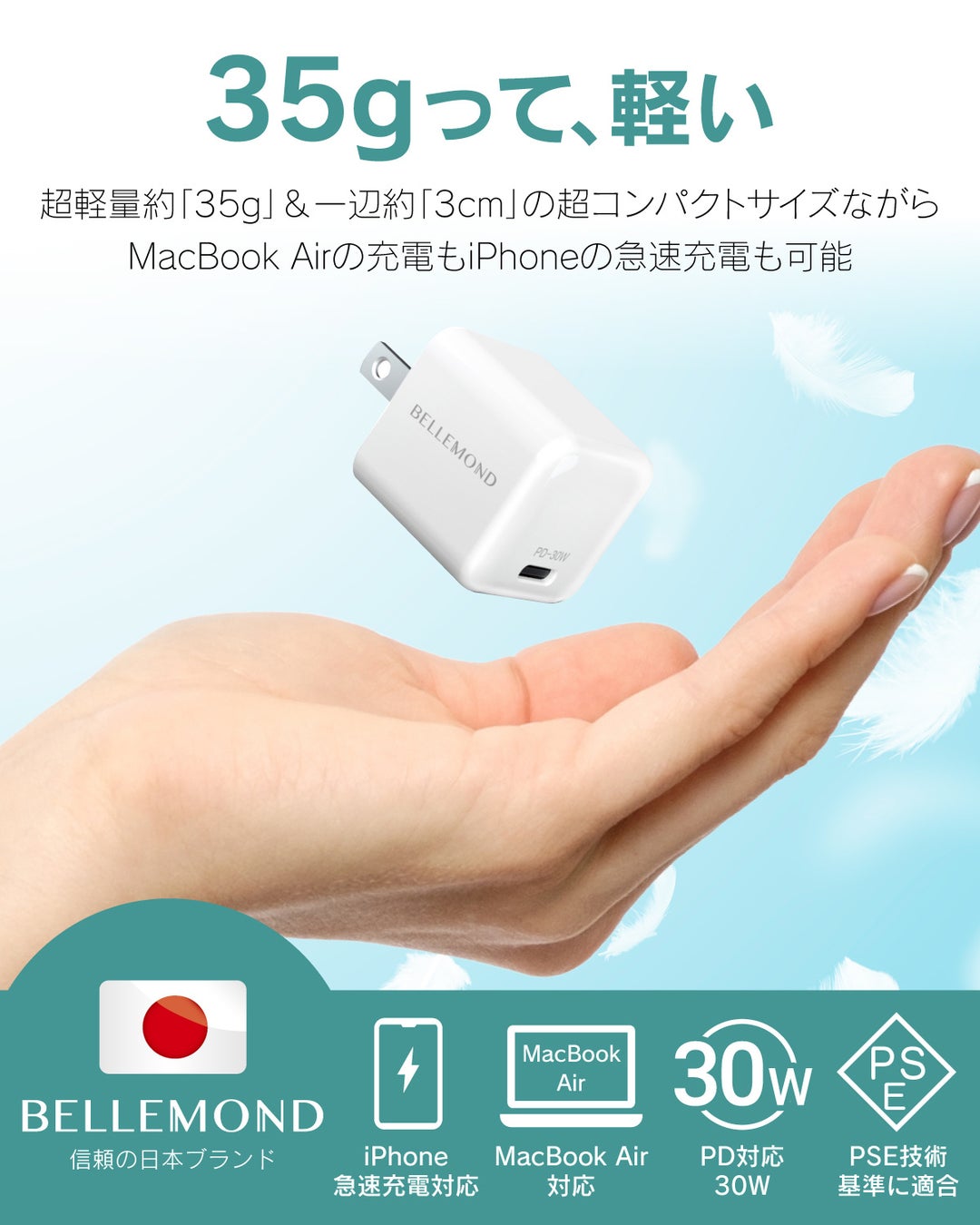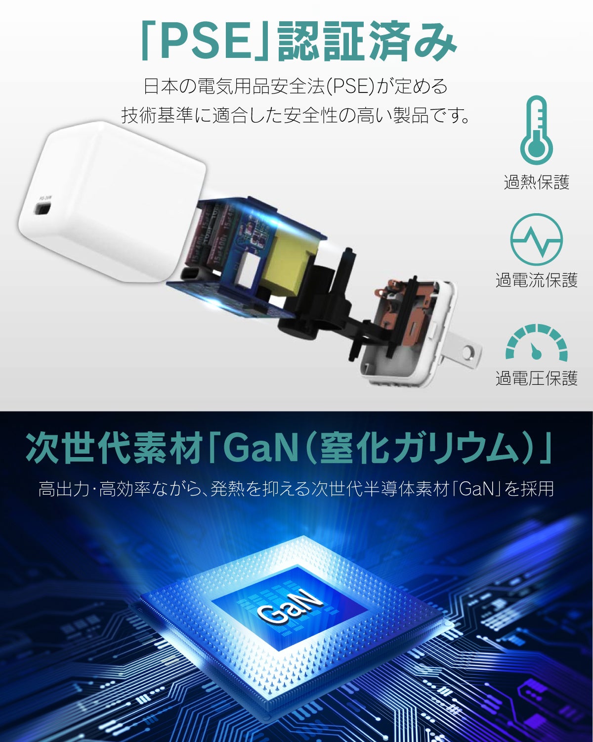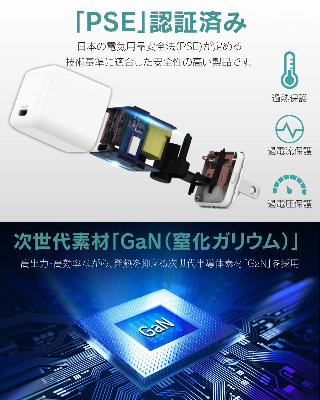 「Ultra Mini 30W」には発熱を抑えながら⾼効率・⾼出⼒を実現する次世代半導体素材GaN(窒化ガリウム)を採⽤しました。⽇本の電気⽤品安全法(PSE)が定める技術基準に適合しているため、⾼性能な最新型充電器を安⼼してお使いいただけます。