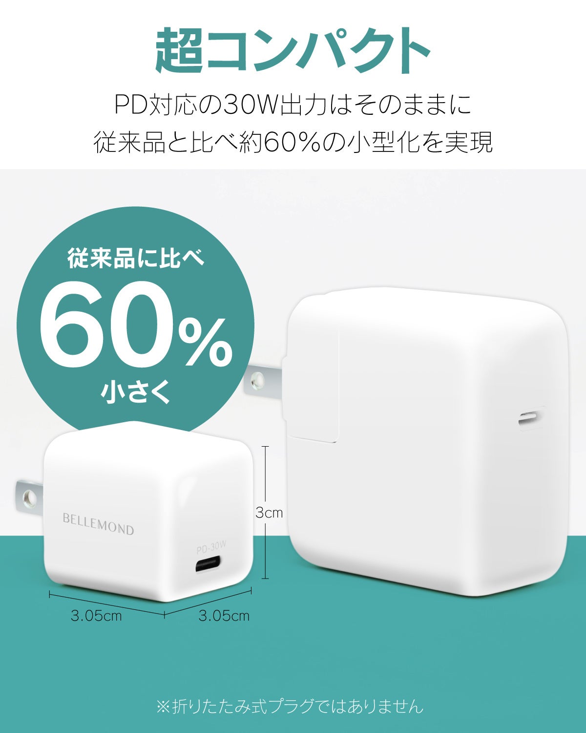 ベルモンドの「Ultra Mini 30W」は一般的な30W充電器と比べ約60%の⼩型化を実現しました。