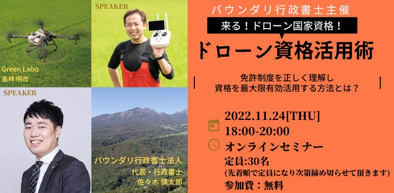 ドローンの関連許認可申請とソリューション開発を専門とするバウンダリ行政書士法人(本社:宮城県、代表行政書士:佐々木 慎太郎)は、エル・アバンダンス株式会社(本社:東京都、代表:原 栄二)とともに、ドローンの新規事業や操縦資格の取得を検討している方を対象とした「ドローン資格活用術セミナー」を2022年11月24日(木)に開催いたします。