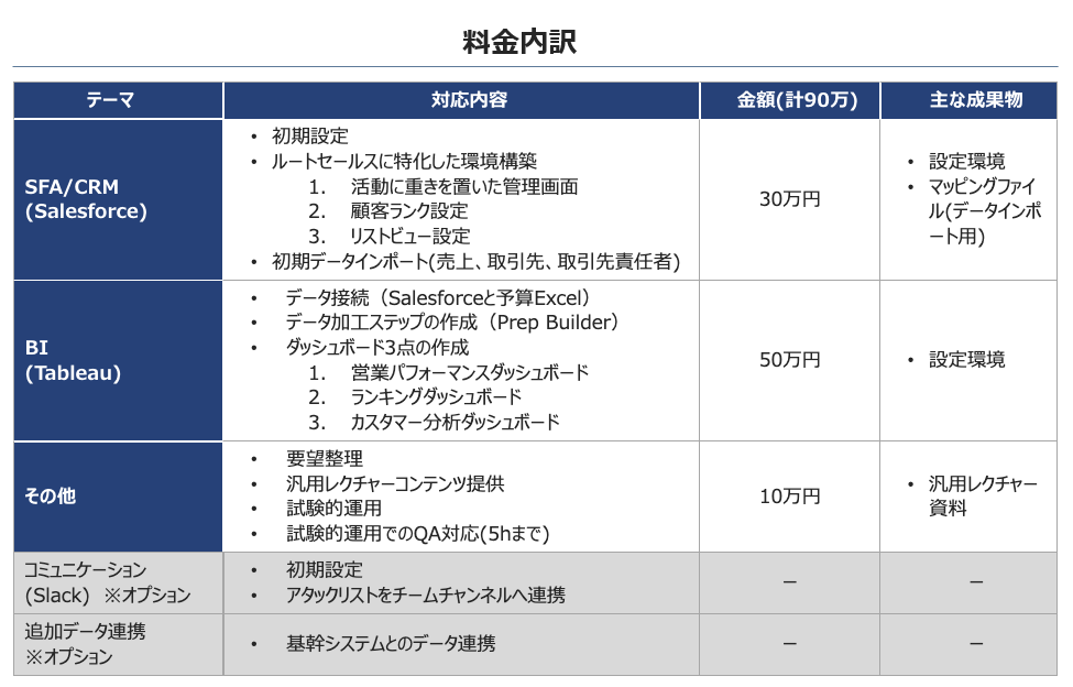 これまでの500社以上のSalesforce/Tableau導入支援経験を活かし、ルートセールス管理のノウハウを凝縮したパッケージとなっているためベストプラクティスの迅速な導入が可能です。
