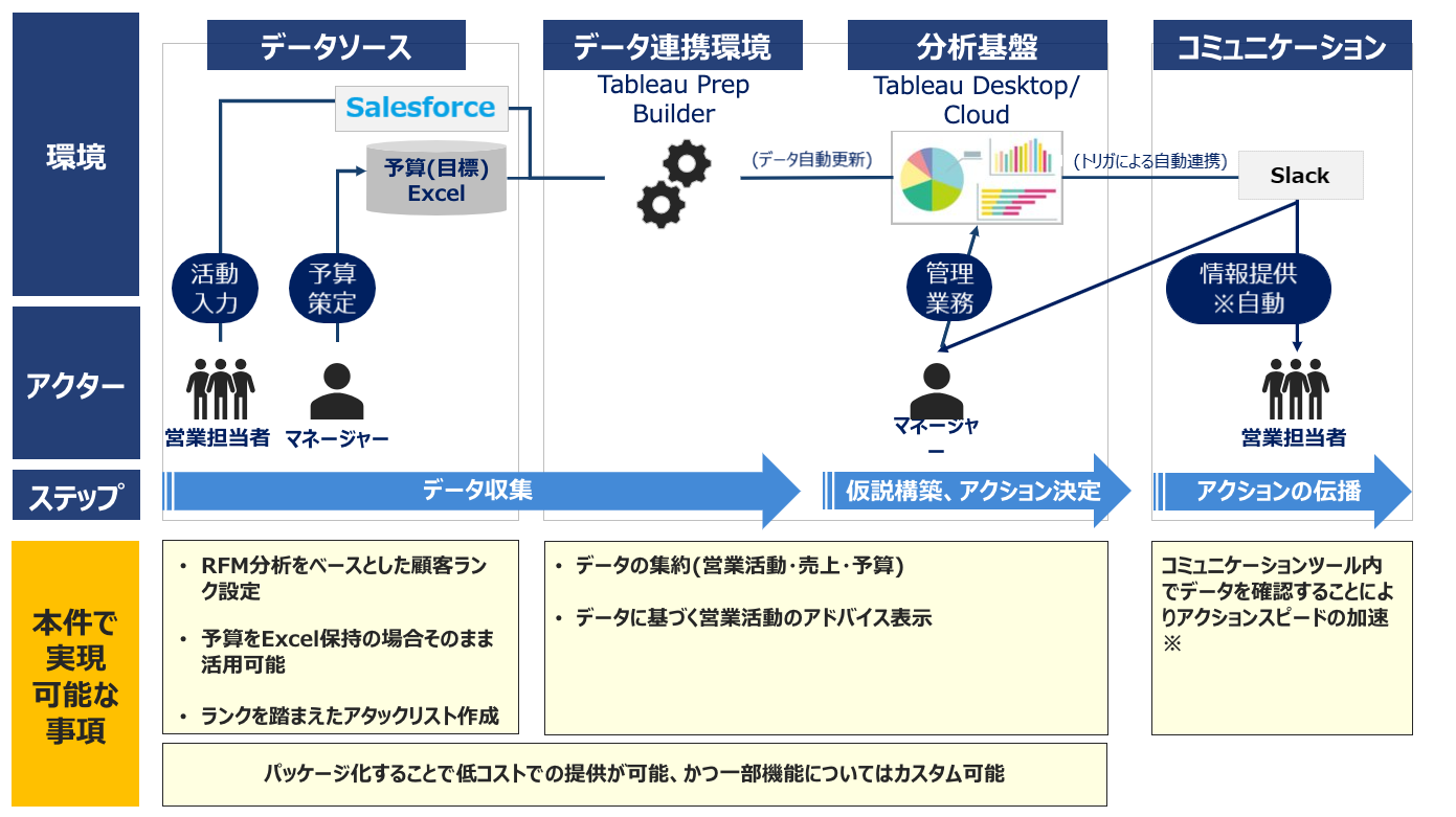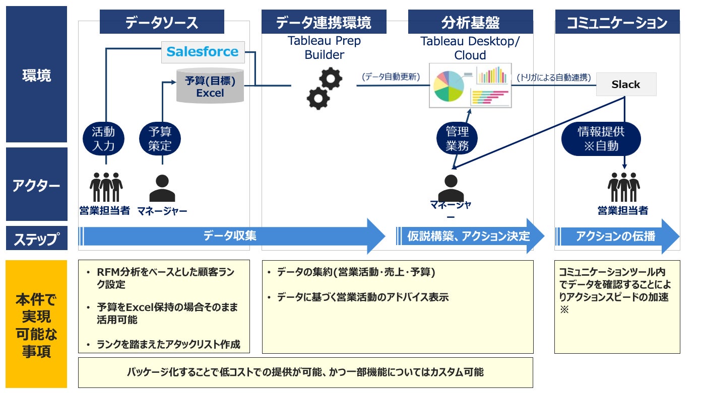 本パッケージはSalesforce環境構築・初期データインポート・Tableau構築・汎用レクチャー・テスト運用