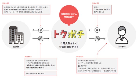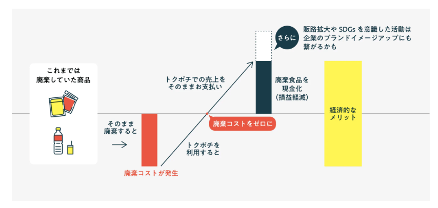今まで廃棄していた商品や余剰在庫と会員さまをマッチングさせて販売し、 配送までを行うことで、食品事業者さまの人件費を使って現金化する業務をトクポチが人件費無料で代行させていただくビジネスモデルに賛同いただいてます。