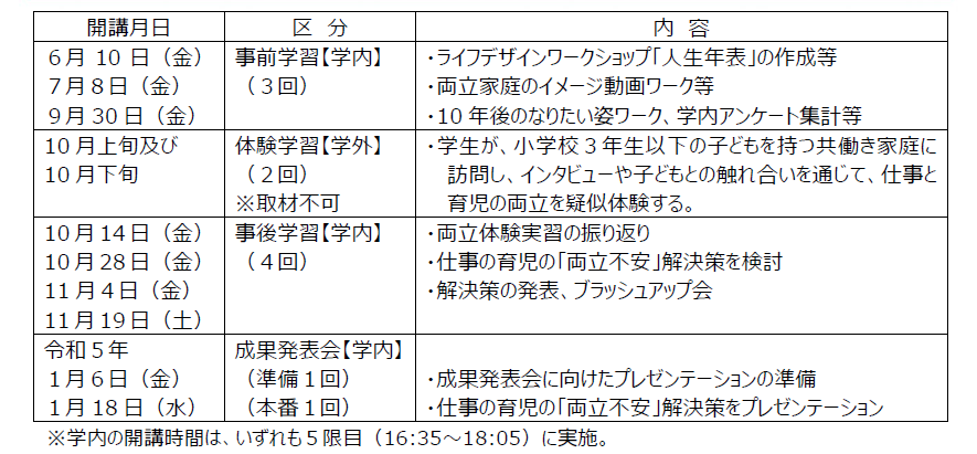 本学の「キャリア形成ゼミ」と京都府の「仕事と育児の両立体験プログラム」の実施の目的が合致することから、京都府の「仕事と育児の両立体験プログラム」を組み込んだ『仕事と育児の両立体験・ライフデザイン探求ゼミ』を、以下のとおり初めて開講することとなりました。