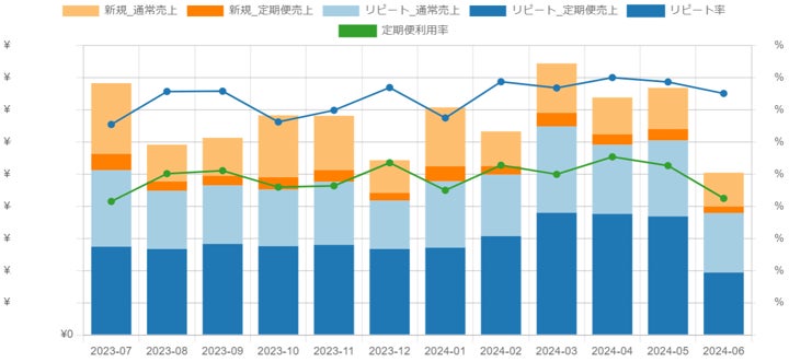 商品ごとの新規及び既存顧客の購入パターンを詳細に分析し、一般購入及び定期購入の傾向を明確にすることで、顧客ロイヤルティの向上策を導き出します。