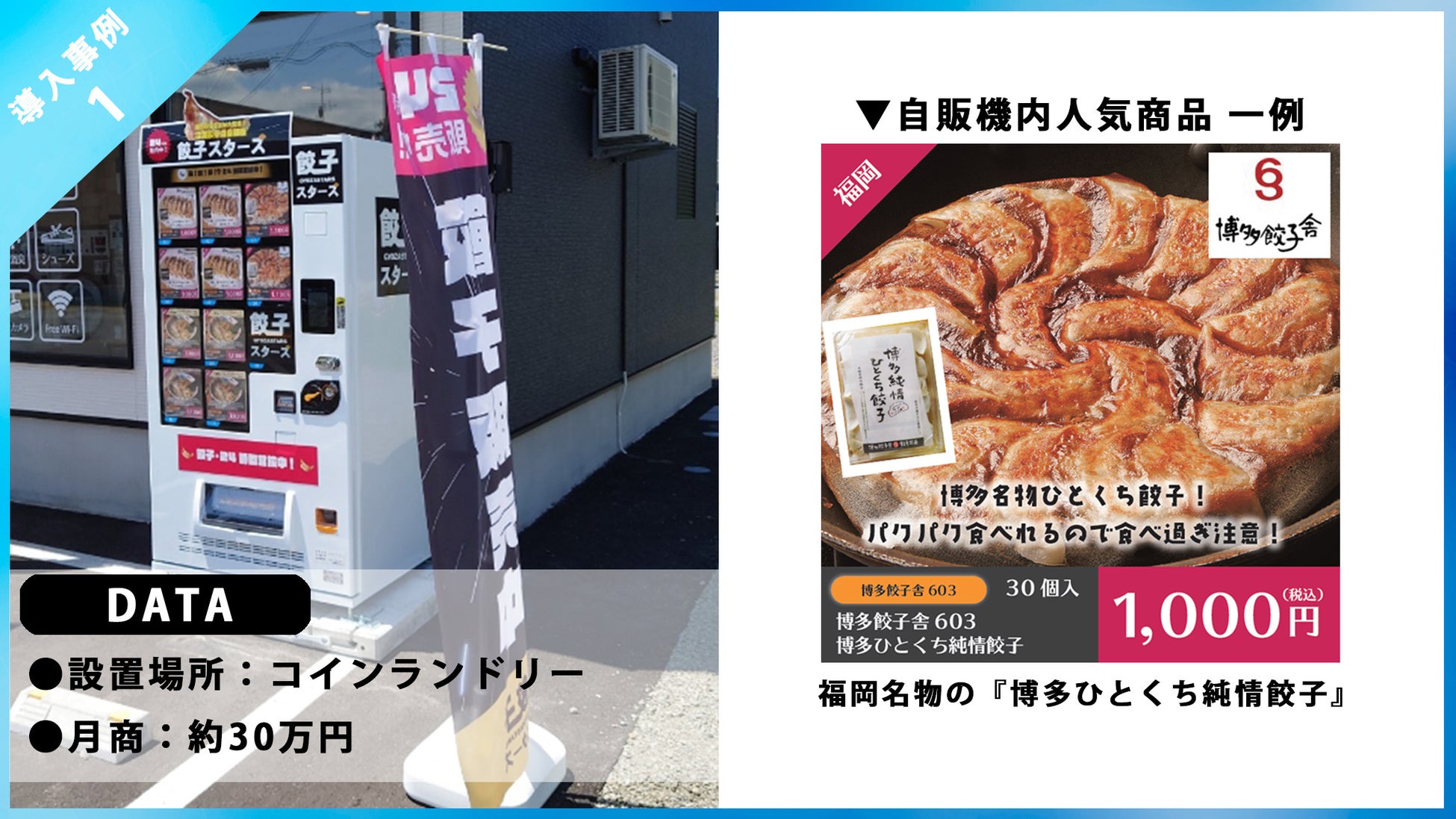 自動販売機のインパクトある企画とデザインもこのままご使用いただける為、中に入れる商品(餃子)を選び、仕入れて販売するだけの簡単運用です。
