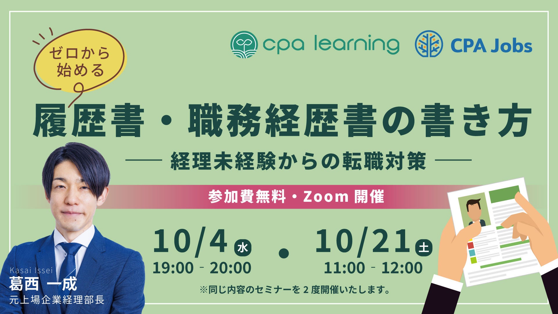 10/21(土)には「経理の転職」講座を担当する葛西一成講師がZoomにてウェビナーを開催します。本ウェビナーでは、経理職に特化した履歴書・職務経歴書の書き方について解説します。リアルタイムで応募書類の書き方が学べる貴重な機会となっております。書類の通過率を上げたい方には特におすすめの内容となっておりますので是非お申込みください。