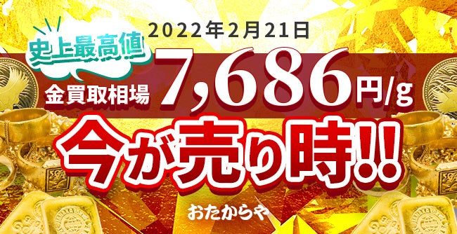 買取専門店「おたからや」は、金買取相場最高値の更新を受けて、金製品の高価買取キャンペーン『今が売り時!買取金額1gあたり300円UP!」を2022年2月21日(月)~27日(日)の7日間、開催いたします。