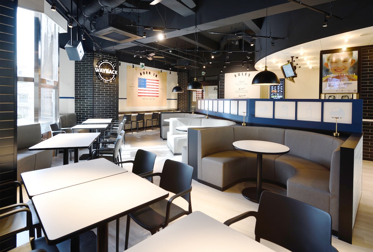 ハンバーガー作りに昔ながらの手作りの要素を加えているのが特徴のWAYBACK BURGERSでは、本場アメリカの昔ながらのハンバーガーやミルクシェイクを楽しめるほか、代替肉(大豆ミート)を使用したハンバーガーも楽しむことができます。また、店内はアメリカンダイナーをモダンにアレンジしたレイアウトとなっており、店舗エントランス脇のショーウインドウに設置された3Dファントムからは、主力商品のハンバーガーが3D映像で浮かびあがり、昔ながらのアメリカの良さと新しさを感じられる店舗となっています。