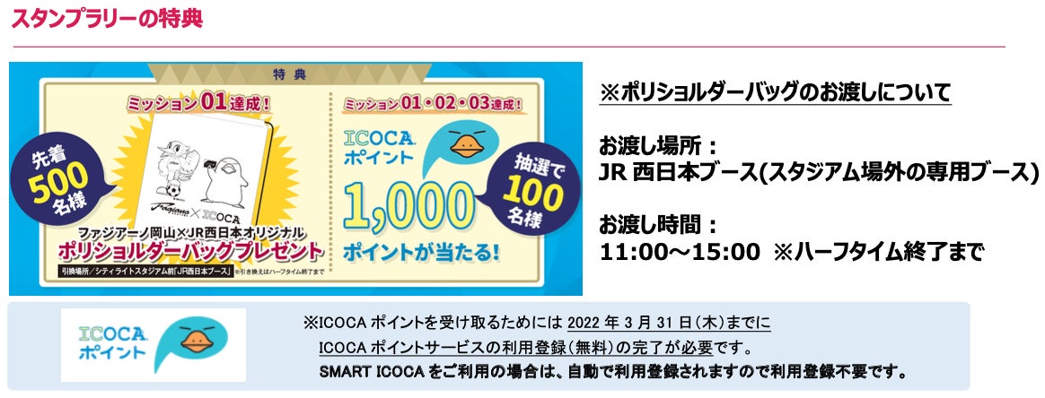 JR西日本とファジアーノ岡山のコラボグッズがもらえる他、抽選で100名様に1,000 ICOCAポイントが当たります!