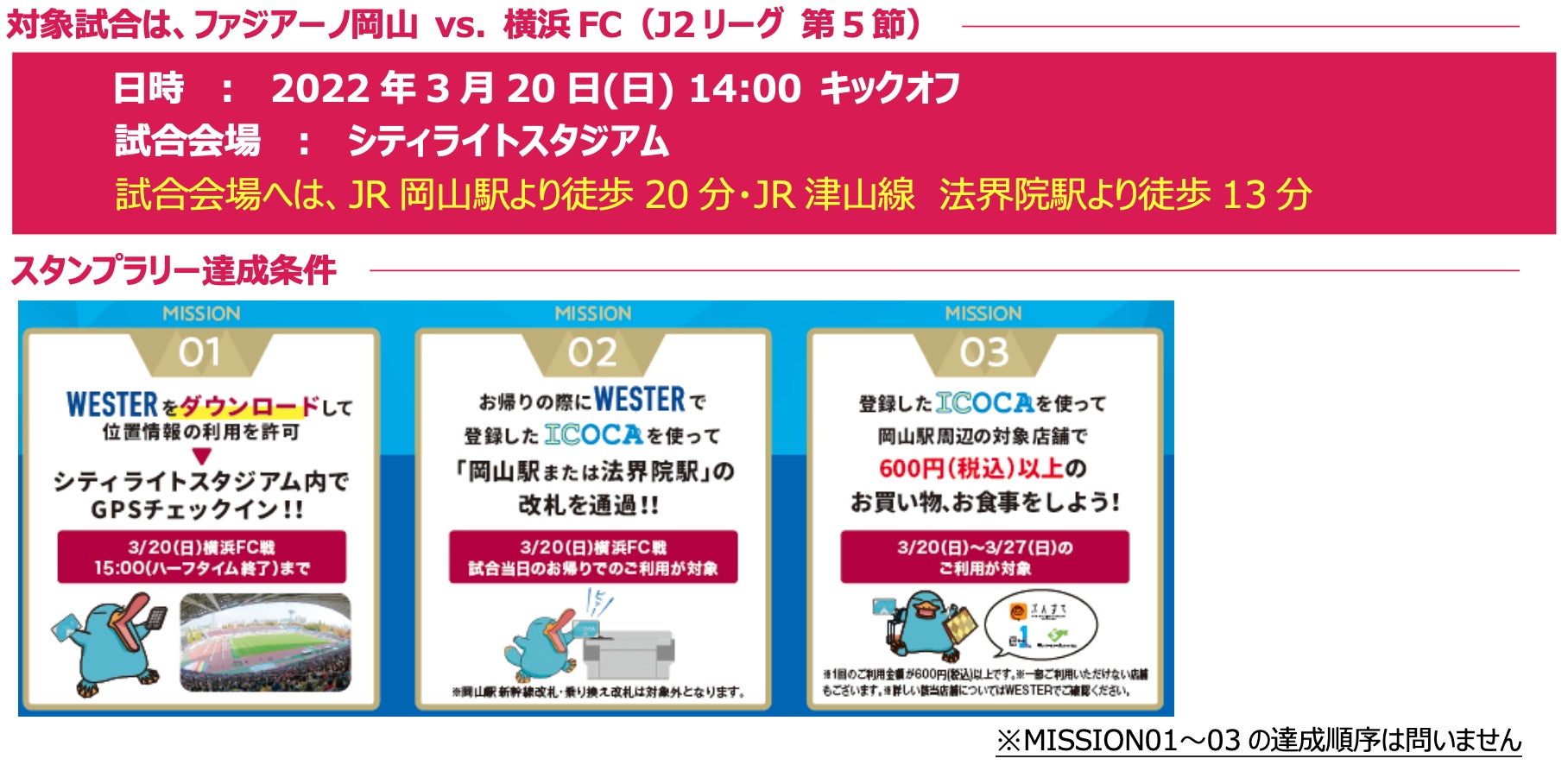 株式会社ギックス(本社:東京都港区、代表取締役:網野 知博、以下、ギックス)と西日本旅客鉄道株式会社(本社:大阪市北区、社長:長谷川 一明、以下、JR西日本)岡山支社は、J2クラブ「ファジアーノ岡山」とタイアップし、2022年3月20日(日)の横浜FC戦における「JR西日本協賛デー」の開催に合わせ、ギックスが提供する個客選択型スタンプラリー「マイグル」と、JR西日本が提供する新常態をサポートするMaaSアプリ「WESTER(ウエスター)」および「ICOCA」を活用したデジタルスタンプラリー「ファジアーノ岡山×JR西日本WESTER de スタンプラリー」を実施します。