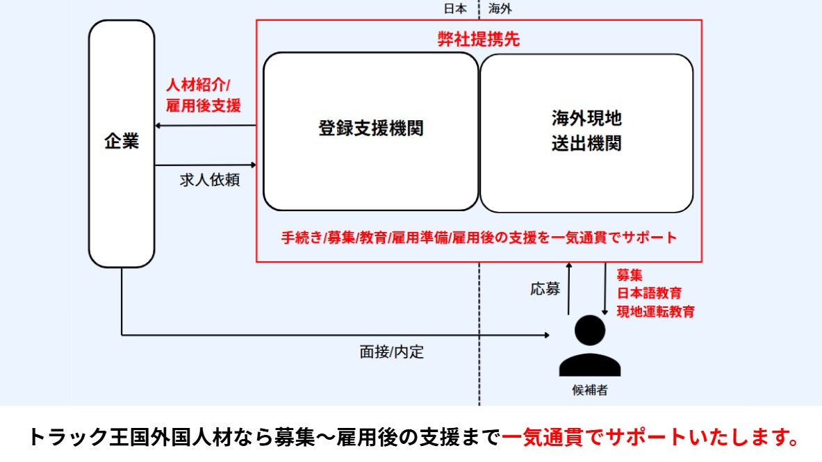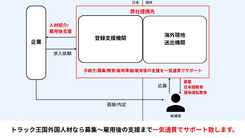 本事業の開始により、トラックオーコクは外国人材の採用から教育・定着までをワンストップで支援する体制を構築します。