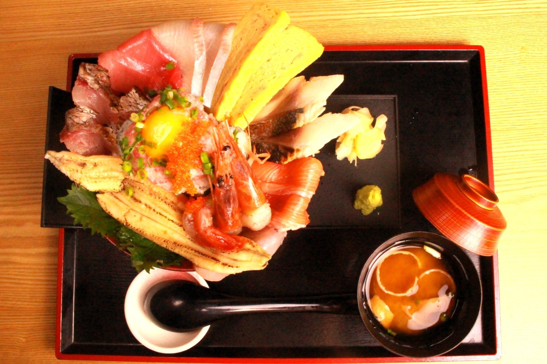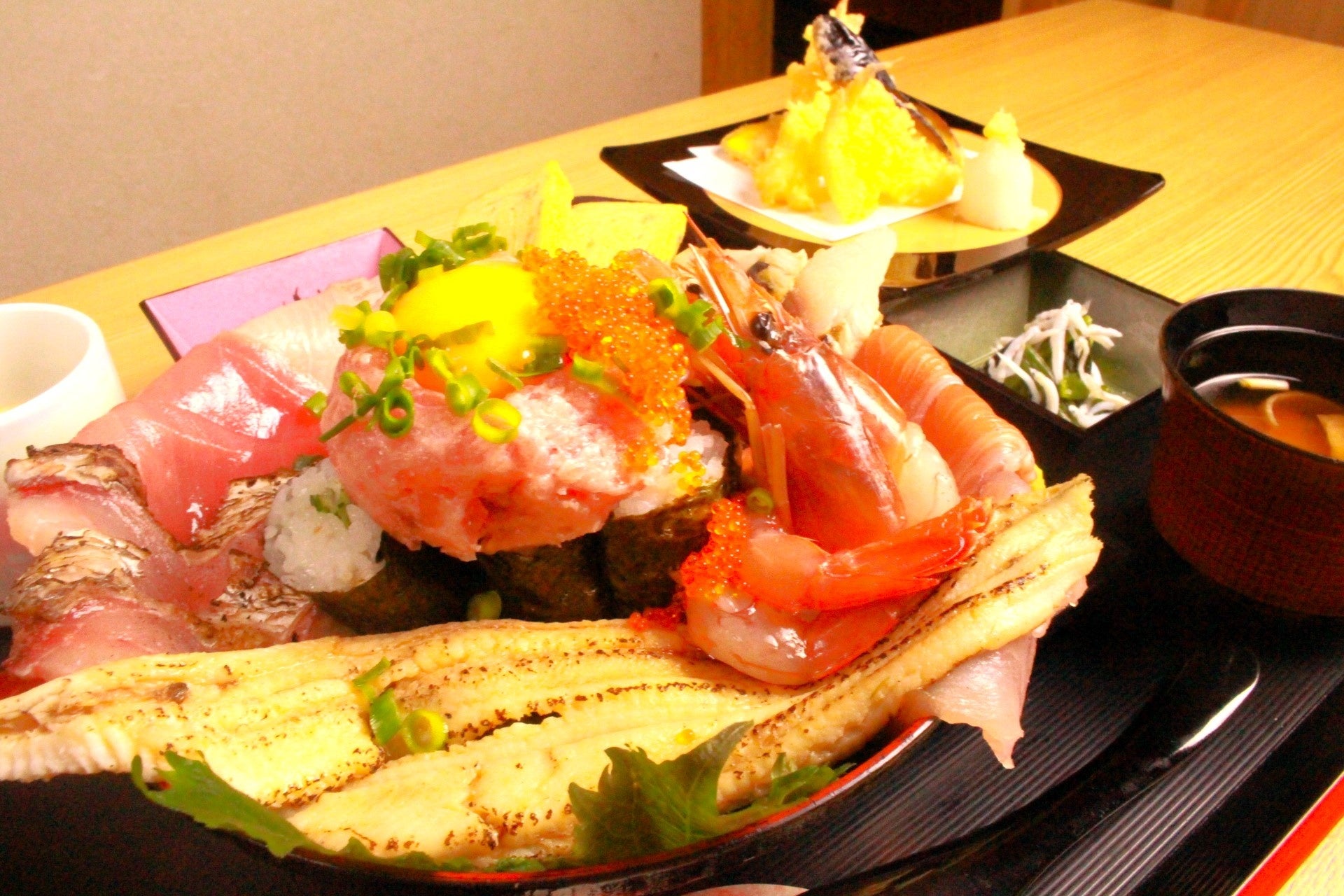 『こぼれ海鮮丼』の一番のウリは、特大サイズの国産天然穴子を店内で丁寧に煮炊き、ふわふわ触感に仕上げているところです。また、仕上げに炙ることで、タレの焦げた香ばしい香りが口の中に広がります。そのほか、本まぐろや旬の鮮魚をふんだんに使用したボリューム満点、贅沢な海鮮丼です。