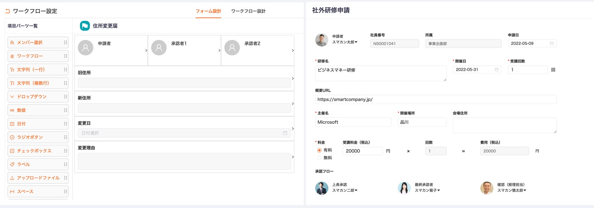 『スマカン』は全機能シンプル設計となっており、導入時においてシステムに関する高度な知識は不要です。ワークフロー機能も同様、申請・承認フローが誰でも簡単に操作が可能です。またレイアウトや項目設定はドラッグ&ドロップで自由に設計できます。