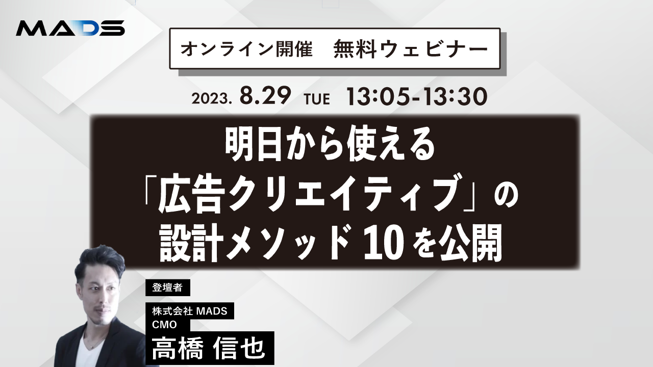 【無料ウェビナー開催のお知らせ】8/29(火)13:05~13:30 | 明日から使える「広告クリエイティブ」の設計メソッド10を公開
