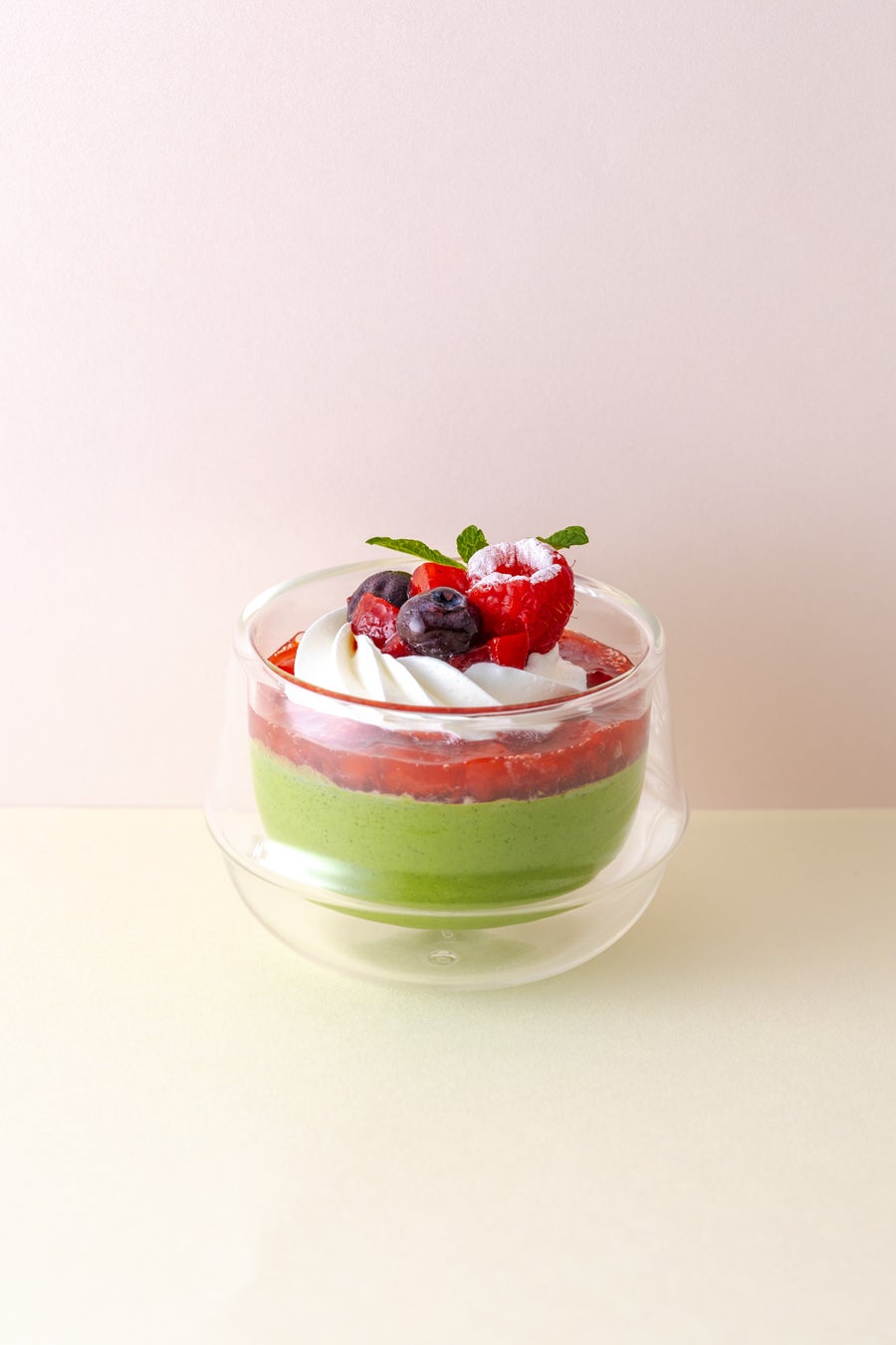つるんとしながらも滑らか食感のMATCHAムースを口に入れた瞬間、MATCHAのほろ苦さと旨味が広がり、甘酸っぱいベリーソースと甘いホイップクリームがMATCHAの味わいを引き立てます。甘さ控えめ、暑いシーズンに食べたくなる冷たいMATCHAデザートです。