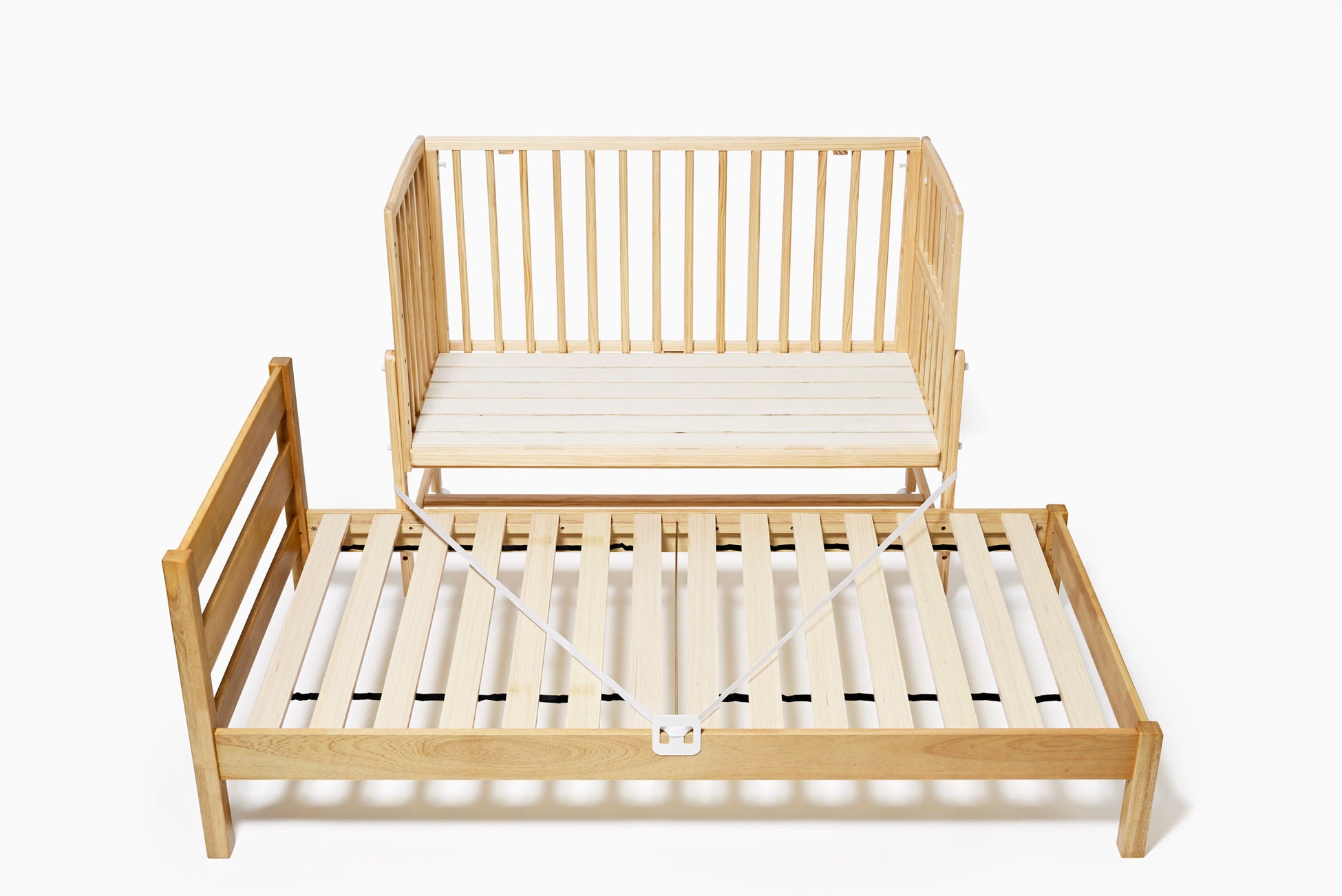 大人のベッドと離れてすき間ができないように、付属のサポートベルトでしっかり固定。