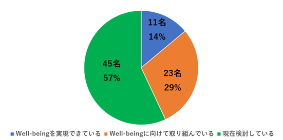 Well-beingを実現できている、実感しているという方は少なく全体の14%となりました。Well-beingが注目され、検討はしているものの具体策が見つからずにいるという声が非常に多く聞かれました。