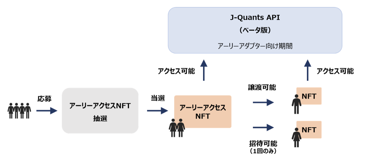 NFTをアクセス権として用いる方法は既存のID/PWやSNSによる認証と比較して、サービス毎に共通の認証情報を利用できる利便性や、記念品にもなるコンテンツという新たな価値提供、譲渡によるコミュニティの新陳代謝や回遊性の実現といったメリットを有していると考えられます。一方で現時点では広く一般に浸透した技術とは言えず、また利用にあたっても一定の知識が必要であるといったハードルも存在しています。今回のJ-Quants APIのアーリーアダプターには、一定の技術や知見を有したユーザや、こうした我々の取り組みを楽しんでいただけるユーザからの応募が多いと想定され、NFT関心層と本サービスとの親和性があると考えたことから、このたびアクセス権としてNFTを利用することとしました。